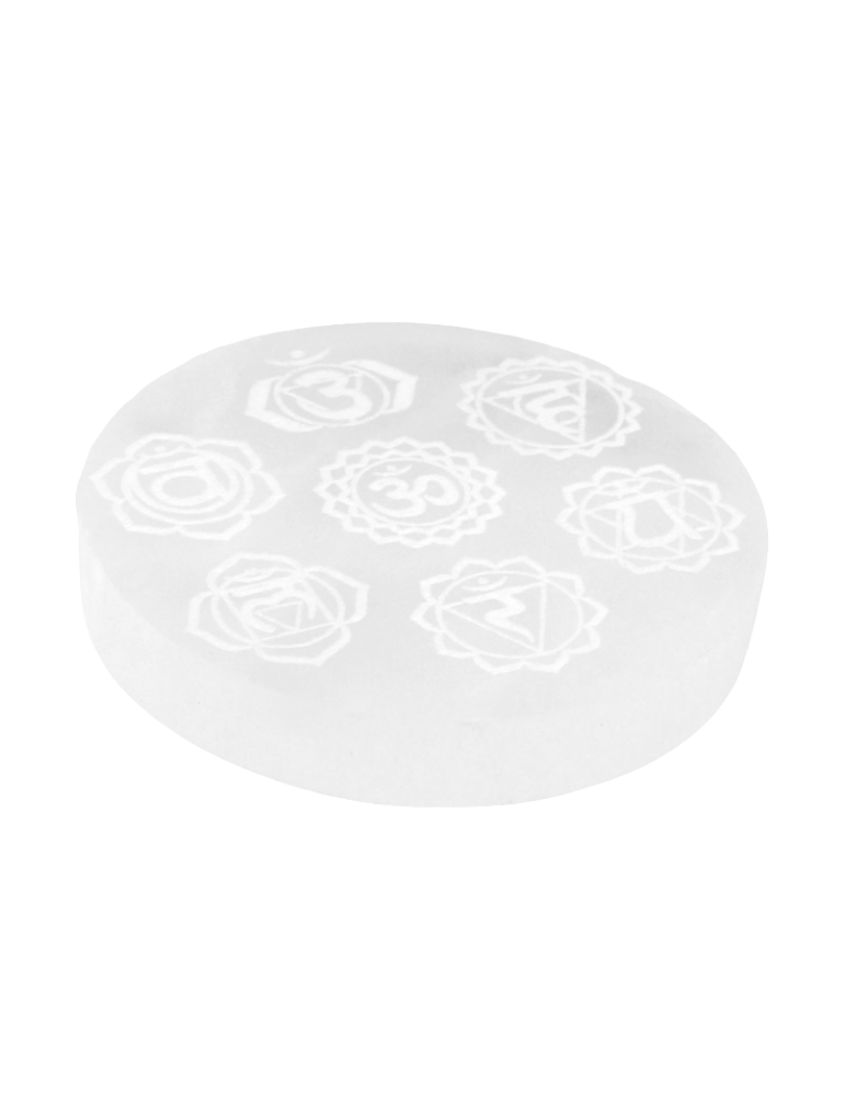 Selenit - Gravierte 7 Chakren Disk zum Aufstellen.