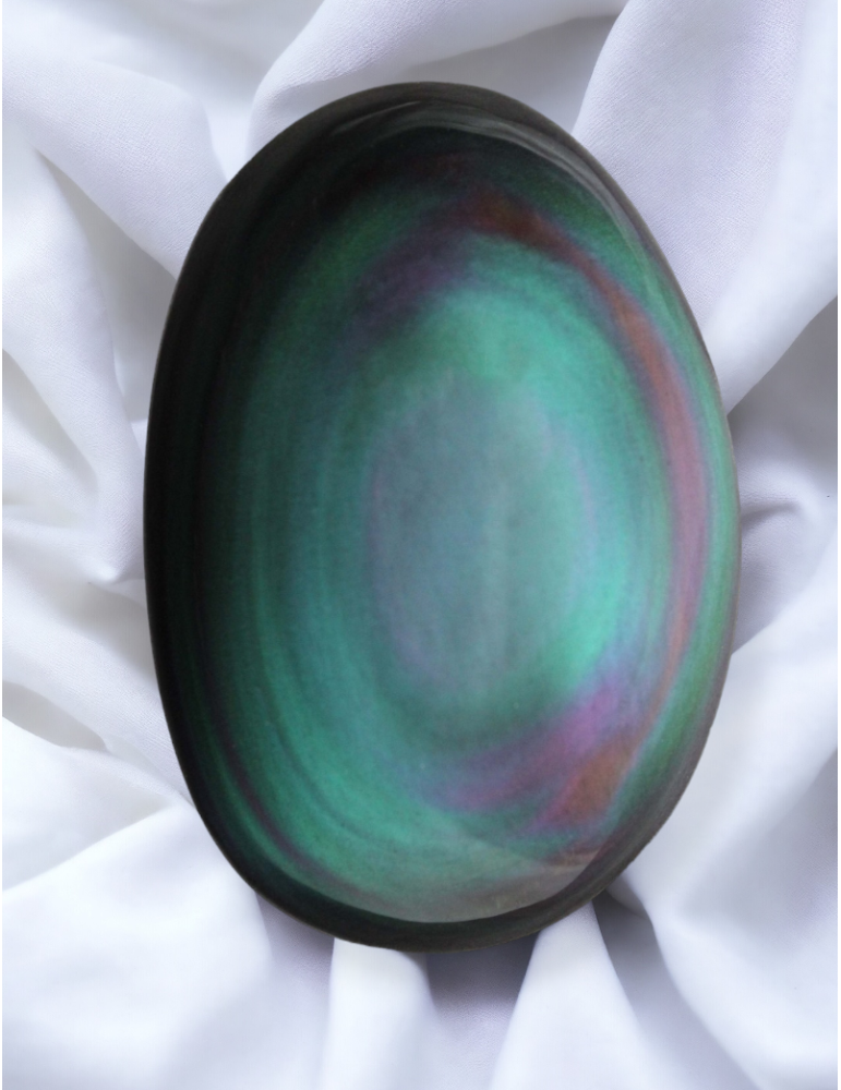 Skulptierte Steinkugel aus Regenbogenobsidian