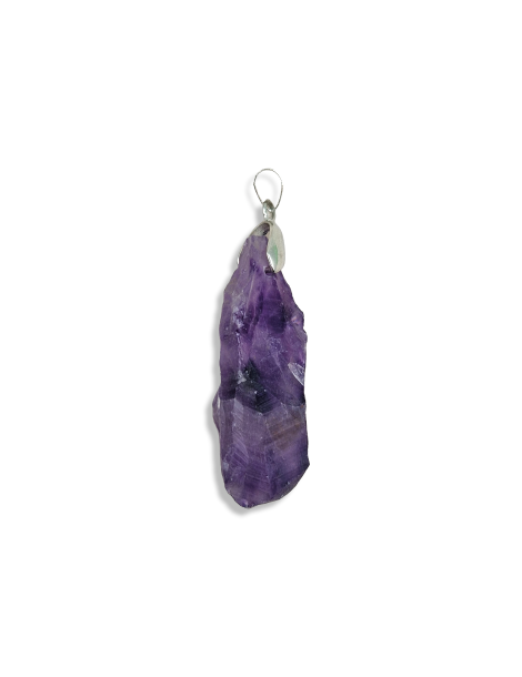Colgante de amatista en bruto, forma de punta. Montado en un engarce de metal.