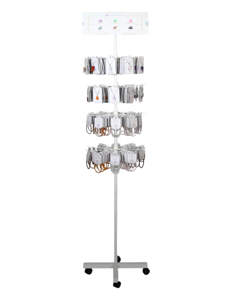 Expositor giratorio que contiene 198 piezas de pulseras de 4, 6 y 8 mm en: Amatista, Aventurina Verde, Cornalina, Cristal de cuarzo, Hematita, Howlita, Ojo de tigre, Jaspe Rojo, Cuarzo rosa, Rodonita, Sodalita.