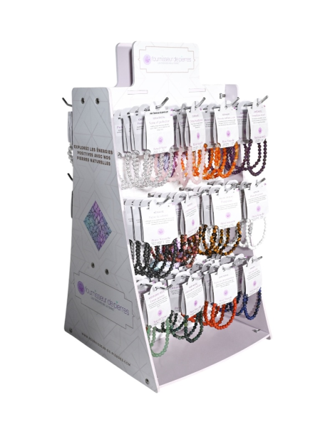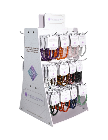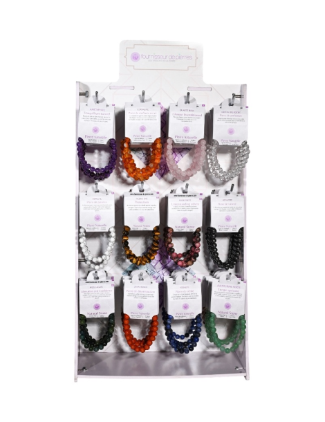 Présentoir contenant 48 pièces de bracelets femme 6 mm en : Améthyste, Aventurine Verte, Cornaline, Crystal de quartz, Fluorite, Hématite, Howlite, Œil de tigre, Jaspe Rouge, Quartz rose, Rhodonite, Sodalite.