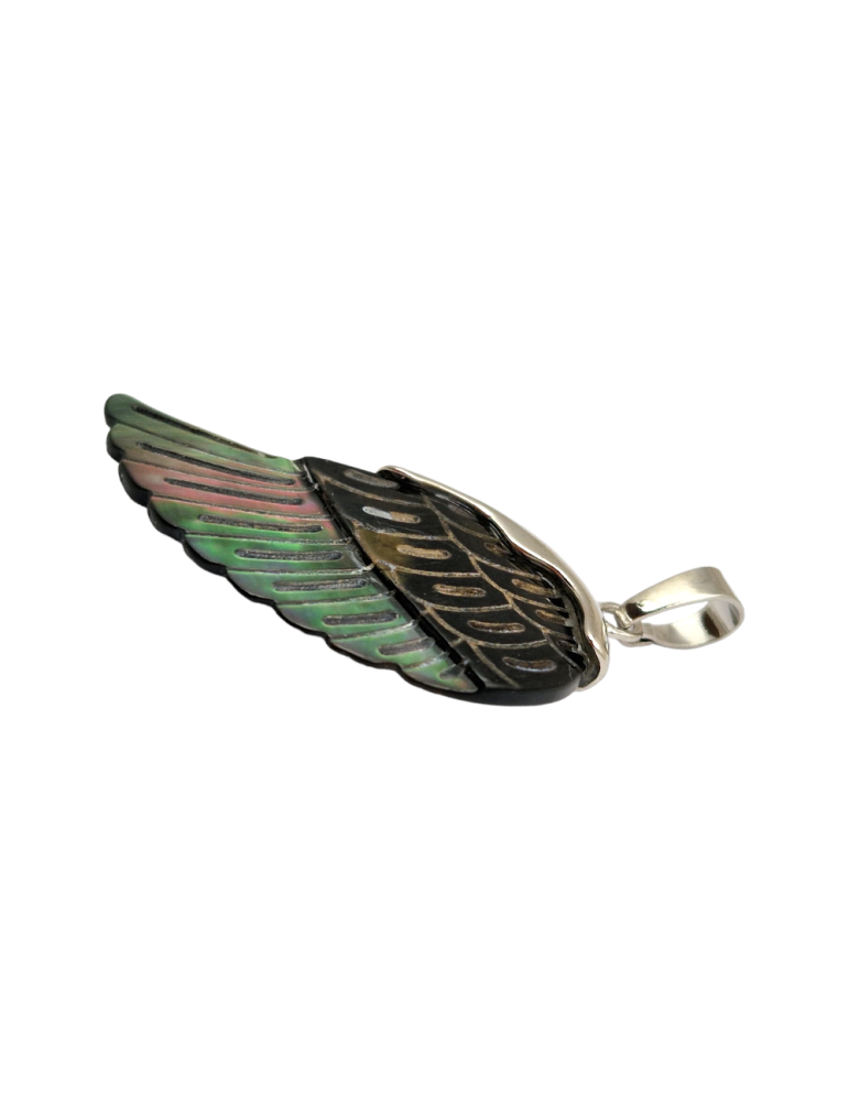 Pendentif aile sculpté en nacre, monté avec une bélière en métal,