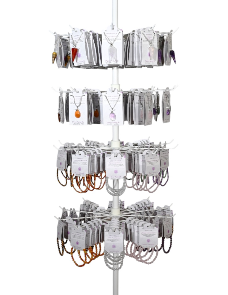 Présentoir tourniquet contenant 198 pièces de bracelets 4, 6 et 8 mm en : Améthyste, Aventurine Verte, Cornaline, Crystal de quartz, Hématite, Howlite, Œil de tigre, Jaspe Rouge, Quartz rose, Rhodonite, Sodalite.