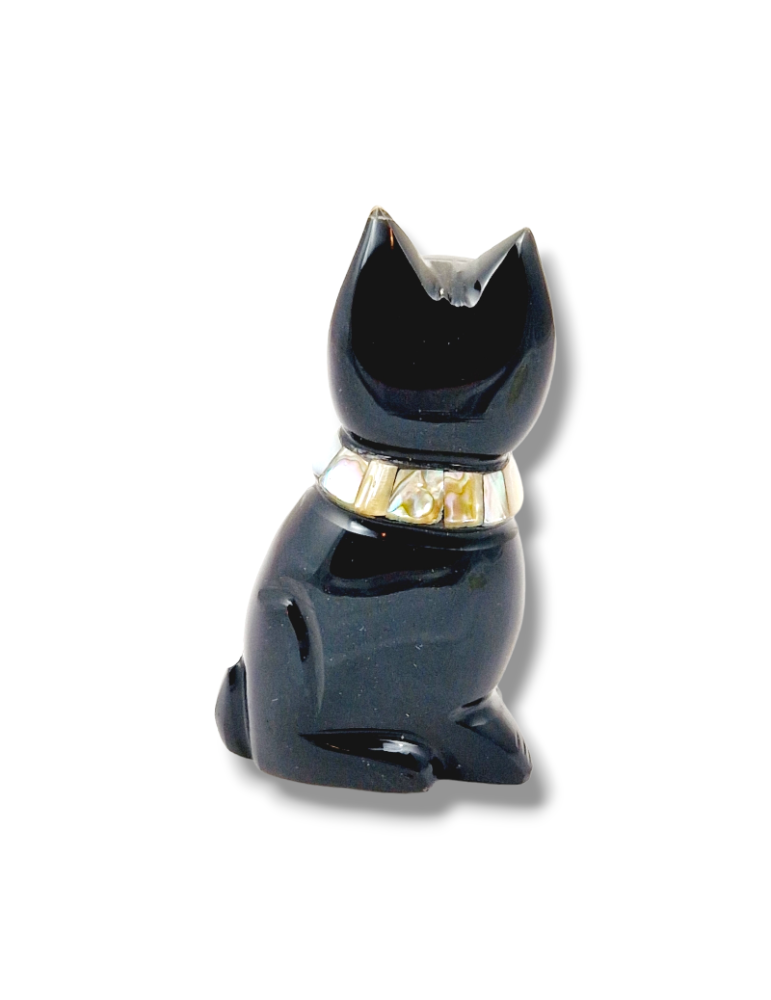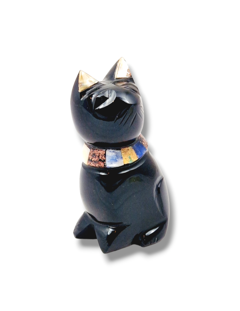 Obsidian cat, inlaid with mother-of-pearl and stone.