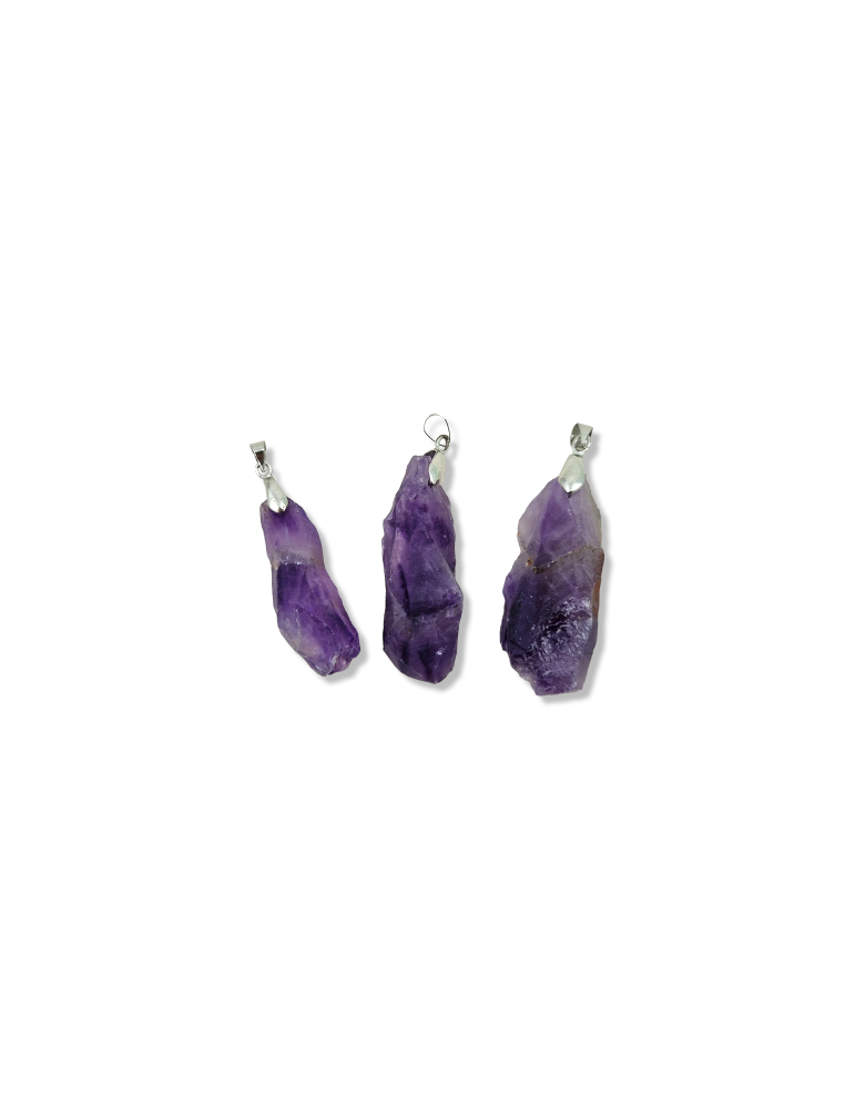 Pendente ametista lordo, forma punta. Montato sul pavimento in metallo.