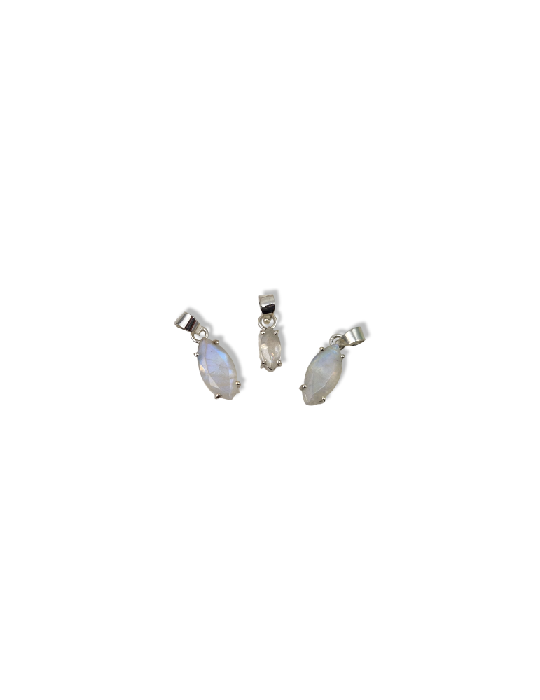 Facetgeslepen hanger van witte labradoriet. Marquisevorm.