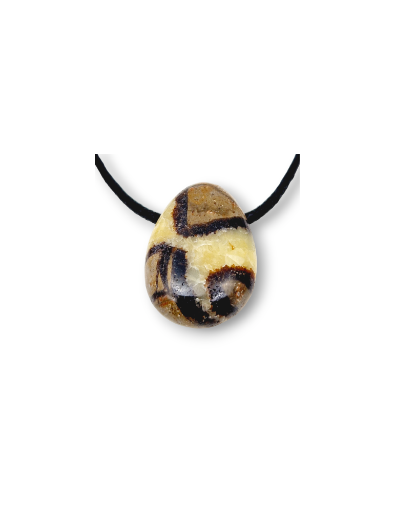 Hangers van gele Septaria voor het doorvoeren van een koord.