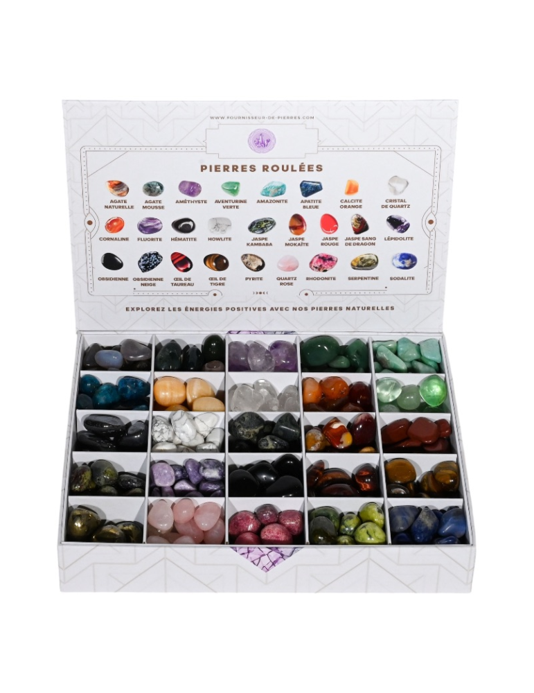 Display met 25 verschillende soorten trommelstenen: Mosagaat, Natuurlijke Agaat, Amazoniet, Amethist, Blauwe Apatiet, Groene Aventurijn, Oranje Calciet, Carneool, Kristal, Fluoriet, Hematiet, Howliet, Kambaba Jaspis, Mookaïet Jaspis, Rode Jaspis, Drakenbloed Jaspis, Lepidoliet, Obsidiaan, Stierenoog, Tijgeroog, Pyriet, Rozenkwarts, Rhodoniet, Serpentijn en Sodaliet.
