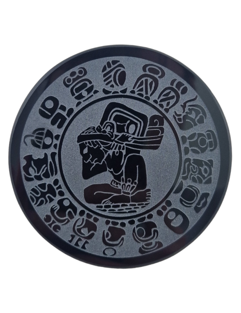 Schijf van zwarte obsidiaan gegraveerd geïnspireerd op de Maya-kalender